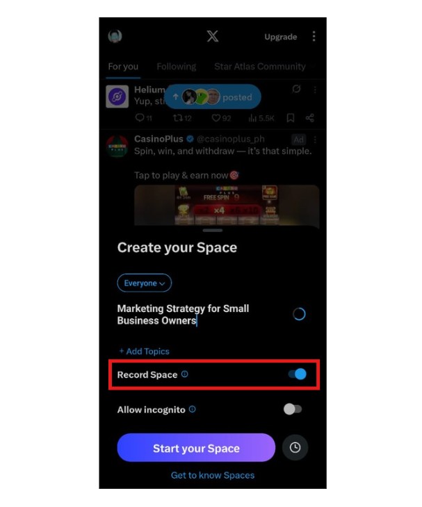Recording your Space preserves the conversation for people who missed it live. Enable recording before starting if you want this option.